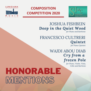 | Honorable Mention and the “Special Prize By Cluster” (Alternate) for the piece “Cry from Frozen pole” for Baritone, piano, violin, viola, and cello, on a poem by Shadi Sawwan, after participation in the LIMF Composition Competition 2020 | |