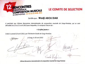| 2013 | Appreciation certificate from “Cergy Pontoise orchestre-studio” after he participated in the “12eme rencontre internationale des Jeunes compositeurs” |